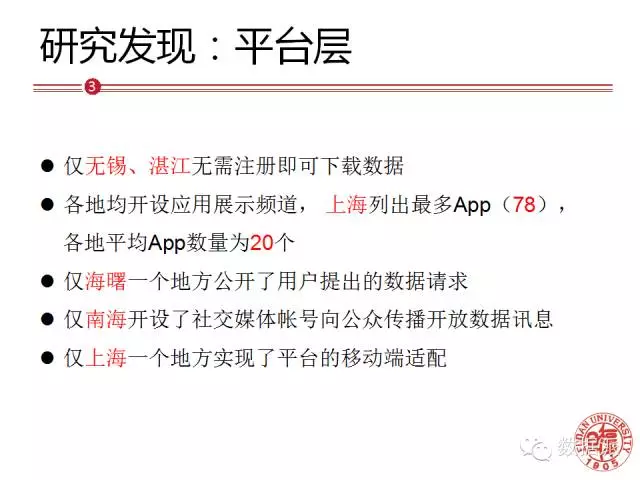 我國開放數(shù)據(jù)的現(xiàn)狀如何?北京和上海在2012年推出平臺。今年我們選了七個有代表性的地方做了一個評估??纯撮_放數(shù)據(jù)到底做得怎么樣,這些數(shù)據(jù)我們都已經(jīng)發(fā)表過了,今天就只簡單說一下。