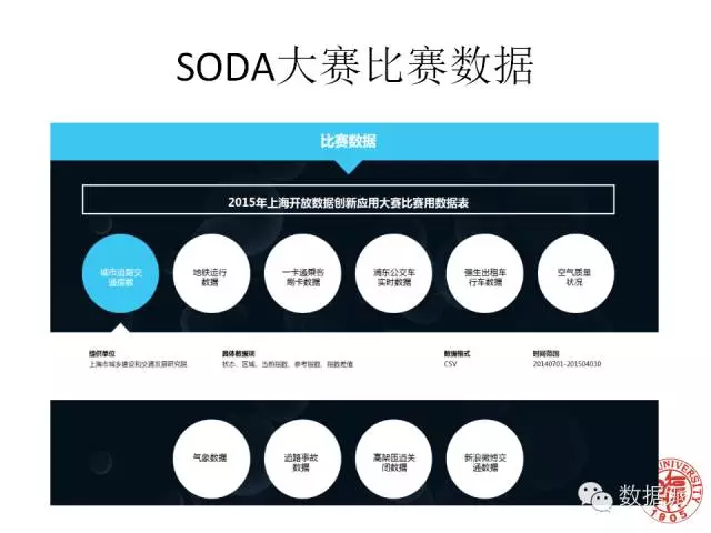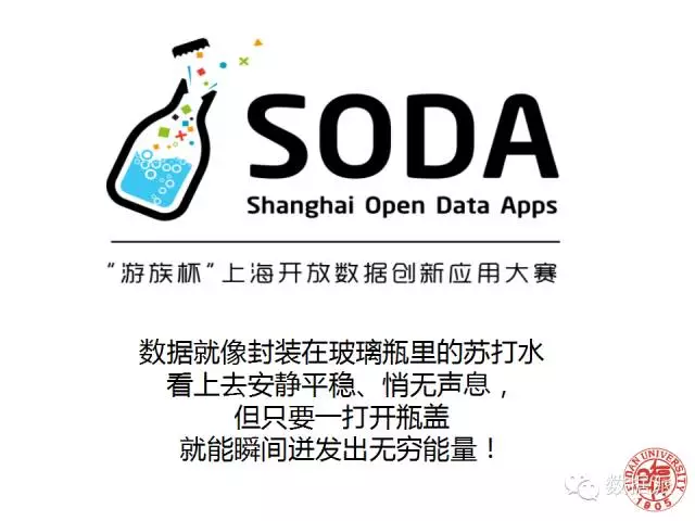 今年上海經(jīng)信委協(xié)調(diào)交通委,一共開放了1TB的數(shù)據(jù),也組織了一個大賽,名稱很好玩,叫SODA大賽。當(dāng)我們把Shanghai Open Data Apps這幾個詞的首字母放在一起的時候,正好就是SODA,就是蘇打水的意思。這正符合開放數(shù)據(jù)的理念。政府的數(shù)據(jù)就像封在瓶子里的蘇打水,關(guān)著瓶蓋的時候看上去悄無聲息,但只要你把瓶子一打開,嘭的一聲,數(shù)據(jù)的能量就迸發(fā)出來了。這個瓶子的logo是我當(dāng)天晚上畫了一個構(gòu)思草圖發(fā)到組委會的群里面,后來專業(yè)的設(shè)計師給畫出來了。在SODA百強派對的時候,真的找來一個大瓶的香檳酒,上面寫著SODA,嘭的一聲把瓶子打開,意思就是數(shù)據(jù)開放了。