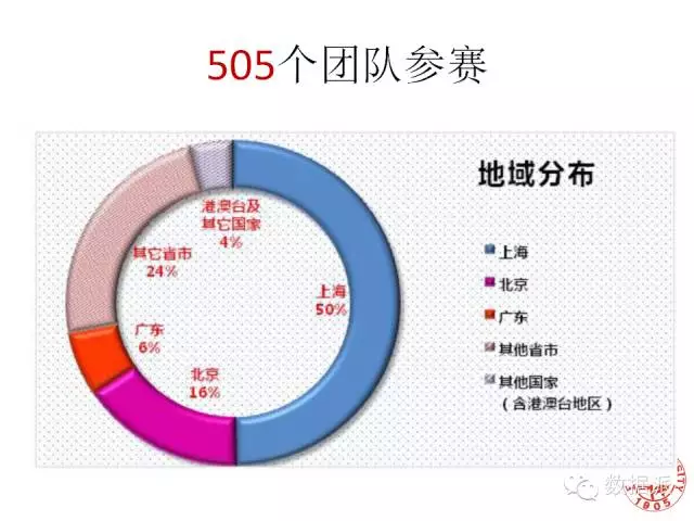 最后來參賽的隊伍的數(shù)量超出組織方自己的想象,主辦方開始預(yù)計有兩百個團(tuán)隊就不錯了,到方案截止前,組委會跟評委們說,不得了,我們評委要很辛苦了,一共有五百多個方案交上來。一半是上海的,還有一半是來自上海以外,北京16%,廣東6%,其他省4%,還有國外的團(tuán)隊。在世界上,一個城市一下子開放這么大的數(shù)據(jù)集也是很轟動的事情,所以很多都過來參加這個比賽。最后選出了一百個方案進(jìn)入復(fù)賽。