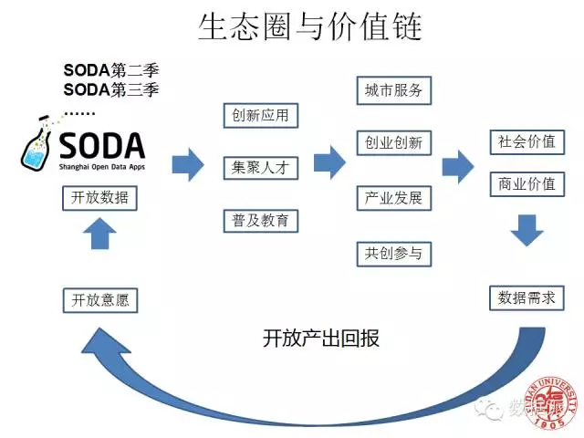 SODA大賽只是剛剛開始,如果只是一個大賽,那就太簡單了,接下來就是怎么讓這些方案落地,對社會產(chǎn)生價值,反過來,政府就會更愿意開放數(shù)據(jù)。大賽的第一波效果是征集了創(chuàng)新應(yīng)用,聚集了一大批人才,對公眾和政府部門普及教育開放數(shù)據(jù)的理念。第二波效果就是給城市提供更好的服務(wù),推動創(chuàng)新創(chuàng)業(yè),推動產(chǎn)業(yè)發(fā)展,最終產(chǎn)生一系列的社會價值和商業(yè)價值,同時又對政府提出了新的數(shù)據(jù)需求,政府更知道社會需要那些具體的數(shù)據(jù),也看到了給社會帶來的價值,就更有意愿開放。