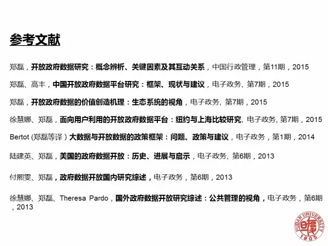 我們實驗室從2011年開始關(guān)注和研究開放數(shù)據(jù),2013年開始發(fā)表開放數(shù)據(jù)方面的論文,上個月剛在中國行政管理也發(fā)了一篇。今天由于時間關(guān)系,還沒有講透的地方,大家可以參考這些論文。謝謝大家!