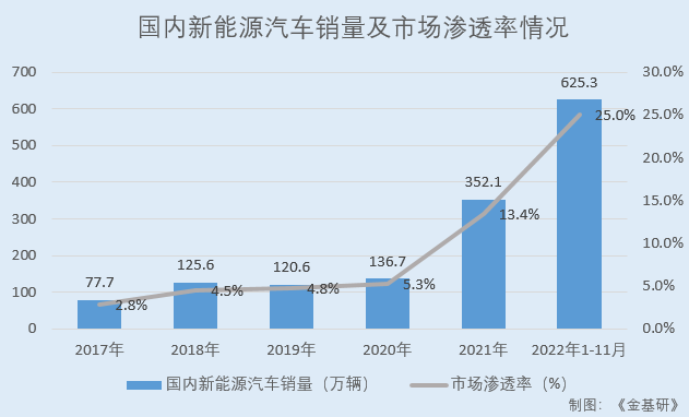 據(jù)中汽協(xié)數(shù)據(jù),2017-2021年及2022年1-11月,國內(nèi)新能源汽車銷量分別為77.7萬輛、125.6萬輛、120.6萬輛、136.7萬輛、352.1萬輛、625.3萬輛,市場滲透率分別為2.8%、4.5%、4.8%、5.3%、13.4%、25.0%。