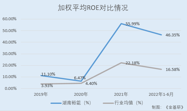 經(jīng)金基研計算,2019-2021年及2022年1-6月,上述四家湖南裕能同行業(yè)可比公司的加權(quán)平均ROE均值分別為3.93%、4.40%、22.18%、16.58%。
