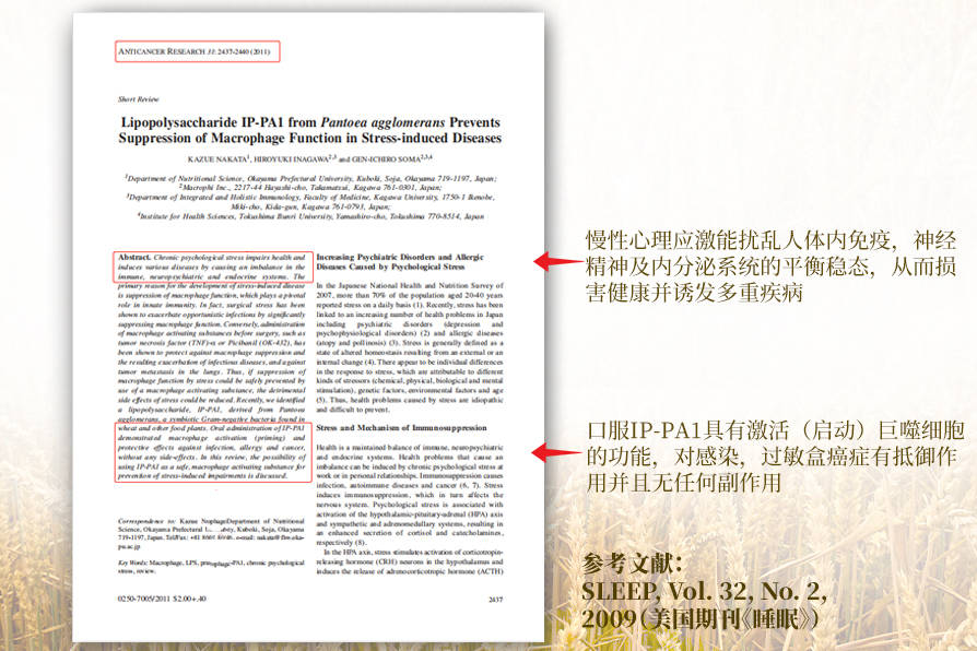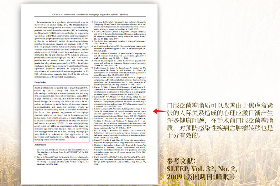 (備注:慢性心理應急能擾亂人體免疫、神經(jīng)精神性及內(nèi)分泌系統(tǒng)的平衡穩(wěn)態(tài),從而損害健康并誘發(fā)多種疾病??诜壕侵|(zhì)可改善由于焦慮和緊張的人機關(guān)系造成的心里應急日漸產(chǎn)生的許多健康問題。在手術(shù)前口服泛菌糖脂質(zhì),對預防感性性疾病和腫瘤轉(zhuǎn)移也是十分有效的