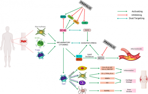 根據(jù)研究,蜂膠灌胃可以降低血清TNF-α、IL-1β和IL-6,而較低劑量誘導(dǎo)中度在TNF-α和IL-1β水平方面的反應(yīng)。蜂膠作為T-helper17細(xì)胞具有抗關(guān)節(jié)炎作用,這些細(xì)胞參與了類風(fēng)濕關(guān)節(jié)炎的發(fā)病機(jī)制。因此,建議類風(fēng)濕關(guān)節(jié)炎患者補(bǔ)充蜂膠可通過減少炎癥級(jí)聯(lián)反應(yīng)和促炎指標(biāo)的分泌來控制疾病。