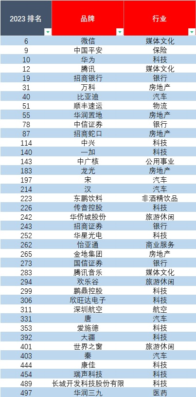圖中為2023年中國品牌價(jià)值500強(qiáng)中39個(gè)上榜的深圳品牌