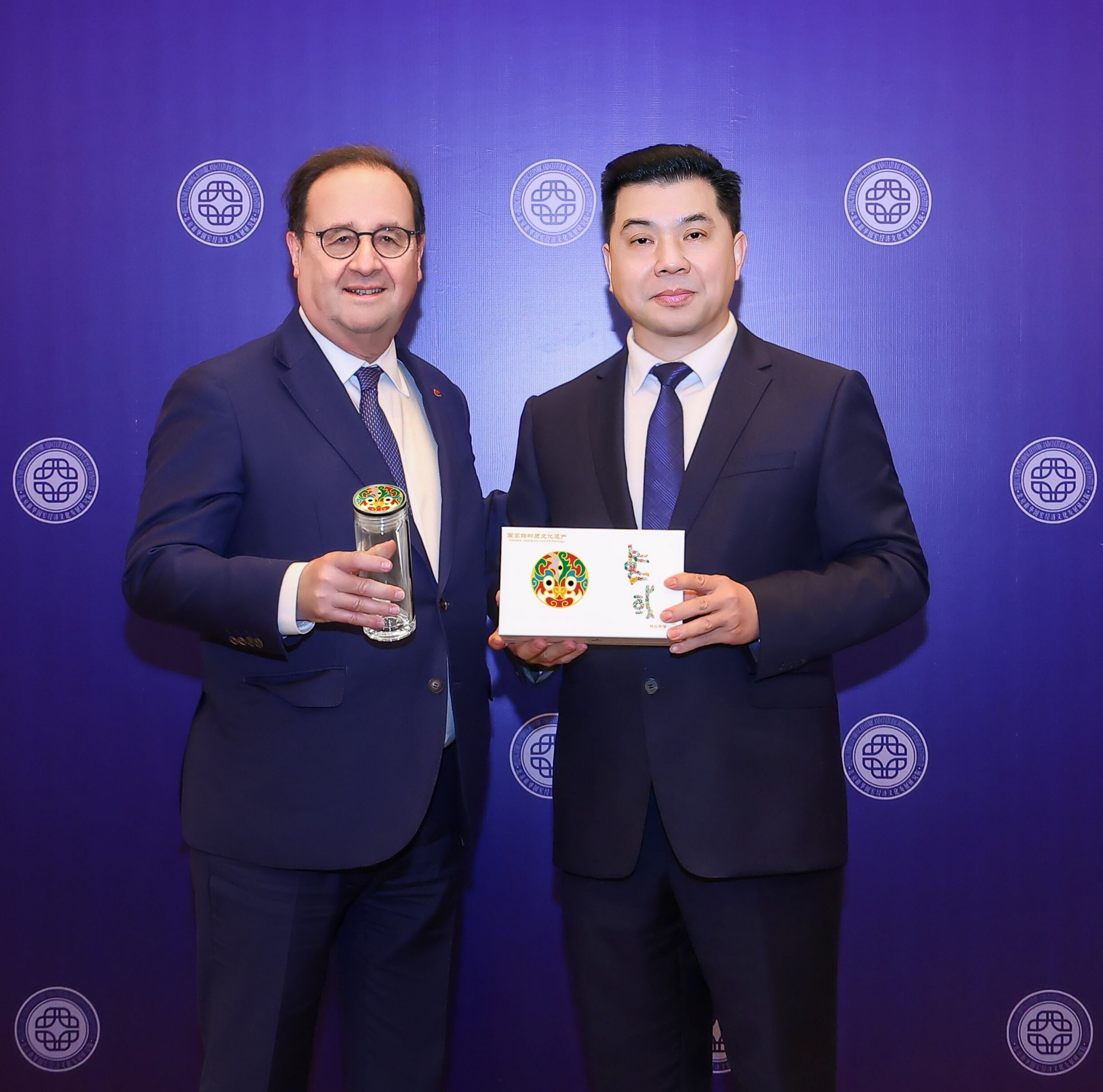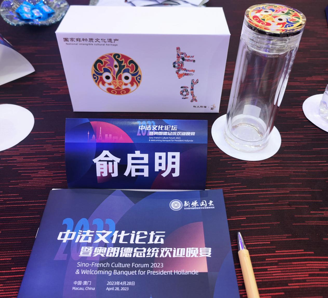 西安啟明緣茶文化有限公司董事長(zhǎng)俞啟明,作為弘揚(yáng)中國(guó)陜西優(yōu)秀傳統(tǒng)非遺文化的優(yōu)秀企業(yè)家代表受邀出席此次論壇。俞啟明以啟明緣非遺聯(lián)名款“社火臉譜”口杯為文化橋梁,在總 統(tǒng)晚宴上與奧朗德總 統(tǒng)及法國(guó)企業(yè)家展開深入交流,進(jìn)一步促進(jìn)兩國(guó)文化交流互鑒和企業(yè)經(jīng)貿(mào)合作,有效推動(dòng)“一帶一路” 建設(shè)。2023年是中法建交的第59年,也是共建“一帶一路”十周年之季。啟明緣非遺聯(lián)名款“社火臉譜”口杯憑借精湛手工藝和獨(dú)特的非遺文化寓意,被本次論壇甄選為重要禮物,禮贈(zèng)法國(guó)前總 統(tǒng)奧朗德,祝福中法友誼源遠(yuǎn)流長(zhǎng),祝福中法兩國(guó)國(guó)泰民安!啟明緣非遺聯(lián)名款“社火臉譜”口杯,杯蓋上的社火臉譜圖案出自陜西寶雞,寶雞社火臉譜獨(dú)具匠心、線條優(yōu)美,文化底蘊(yùn)深厚,在全國(guó)都享有盛譽(yù),也是國(guó)家非物質(zhì)文化遺產(chǎn)。社火臉譜代表鎮(zhèn)守家宅平安、辟邪納福、安泰吉祥、國(guó)泰民安的美好寓意。奧朗德對(duì)于啟明緣非遺聯(lián)名款“社火臉譜”口杯的精湛工藝和非遺文化給予了高度的評(píng)價(jià)和肯定,并與啟明緣口杯創(chuàng)始人俞啟明合影留念。