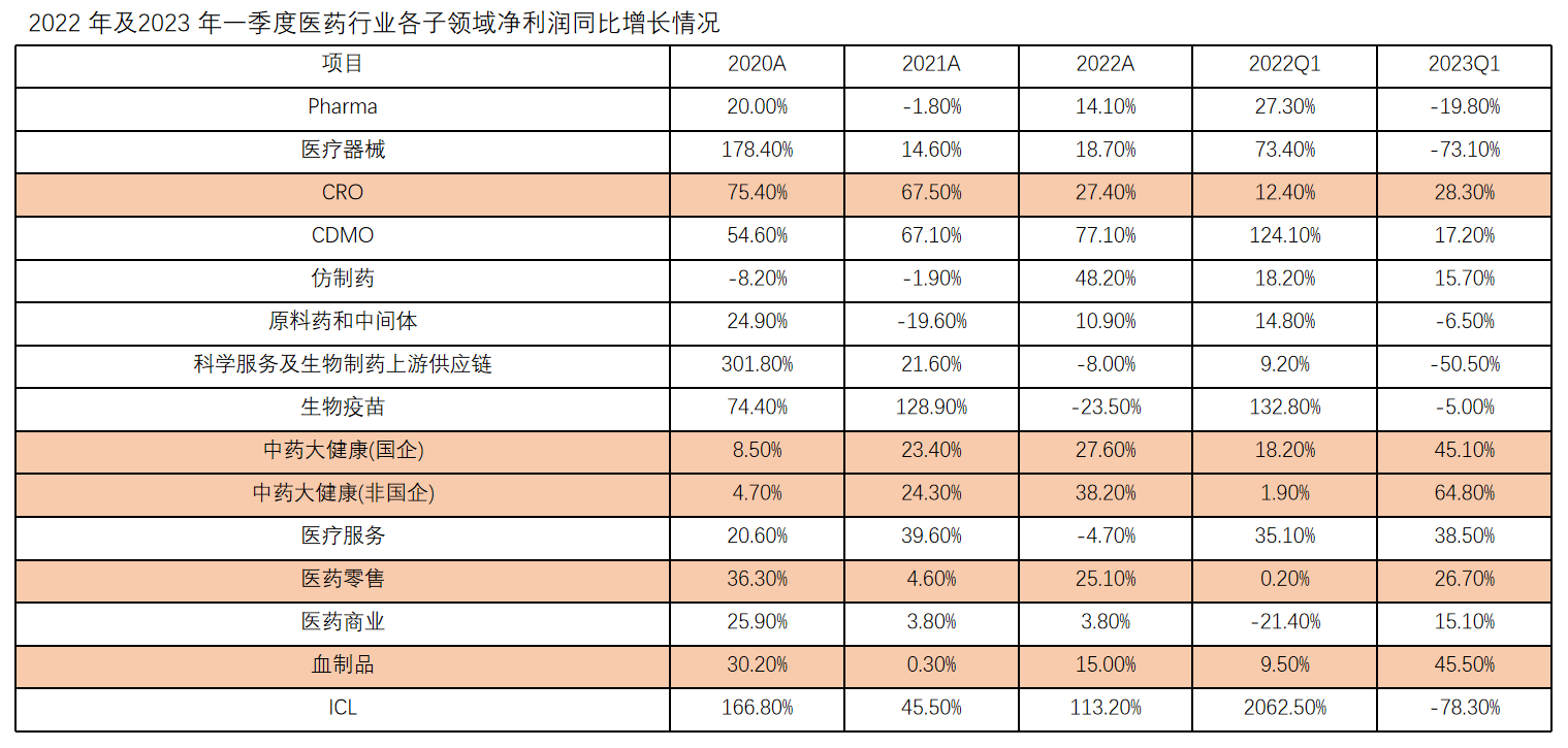 第 一個數(shù)據(jù)是根據(jù)醫(yī)藥企業(yè)上市公司的年報數(shù)據(jù)做出的統(tǒng)計,可以看到在醫(yī)藥行業(yè)的細分產(chǎn)業(yè)里,CRO和醫(yī)藥零售的數(shù)據(jù)表現(xiàn)明顯是要好過于其他領(lǐng)域,在上游研發(fā)和下游銷售都有較好表現(xiàn)的情況下,制藥回暖是有較大支撐的。不同于其他行業(yè),制藥上下游的增長能帶動中游,而非中游制藥的不景氣拖累上下游。