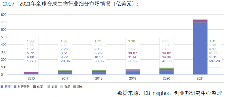 去年開始,行業(yè)的各個論壇、講座都已經(jīng)開始把合成生物學這個概念拿出來講了,足以體現(xiàn)大家對此的關(guān)注度。在2021年開始,合成生物學市場規(guī)模暴增的點,是在于醫(yī)療領(lǐng)域,這里的醫(yī)療包含制藥。