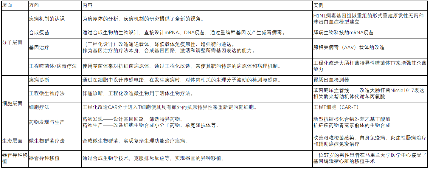 合成生物學在醫(yī)療健康多個細分領(lǐng)域得到廣泛應(yīng)用。不僅可以通過設(shè)計全新的細胞內(nèi)代謝途徑,使醫(yī)藥產(chǎn)品能夠通過微生物細胞利用廉價糖類等原料進行合成,還可以根據(jù)不同的疾病和致病機制,進行人工設(shè)計、構(gòu)建適宜的治療性基因回路,在載體的協(xié)助下植入人體,通過糾正機體有功能缺陷的回路,實現(xiàn)治療疾病的目的。