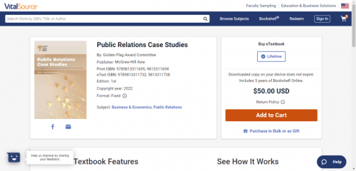 Public Relations Case Studies于2022年在全球發(fā)行并且上線全球最 大電子教材平臺(tái)VitalSource。該平臺(tái)為全球240多個(gè)國(guó)家和地區(qū)的數(shù)千家機(jī)構(gòu)和數(shù)百萬學(xué)生提供在線教材和課程資料。