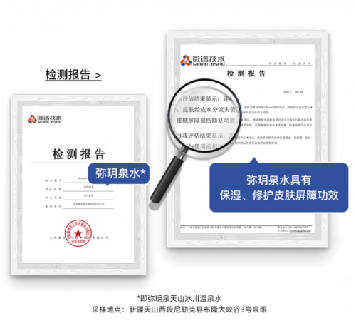 同時(shí),為保證產(chǎn)品的有效性與科學(xué)性,彌玥泉聯(lián)合上海微譜實(shí)驗(yàn)檢測(cè)機(jī)構(gòu),通過(guò)臨床試驗(yàn)、儀器檢測(cè)等方式,對(duì)彌玥泉水進(jìn)行了補(bǔ)水、保濕、舒緩多方面試驗(yàn),結(jié)果表明彌玥泉天山冰川溫泉水能夠有效的緩解、修護(hù)皮膚屏障,從而肯定了彌玥泉產(chǎn)品的溫和、安全和有效。