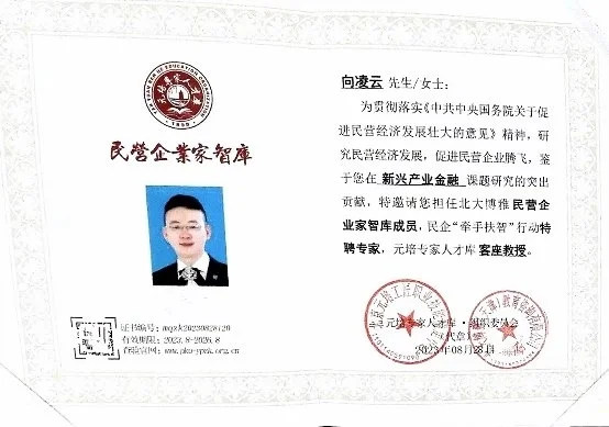 為貫徹落實(shí)《關(guān)于促進(jìn)民營(yíng)經(jīng)濟(jì)發(fā)展壯大的意見》精神,研究民營(yíng)經(jīng)濟(jì)發(fā)展,促進(jìn)民營(yíng)企業(yè)騰飛,鑒于向凌云先生在新興產(chǎn)業(yè)金融課題研究的突出貢獻(xiàn),特邀請(qǐng)擔(dān)任北大博雅民營(yíng)企業(yè)家智庫(kù)成員,民企“牽手扶智”行動(dòng)特聘專家,元培專家人才庫(kù)客座教授。