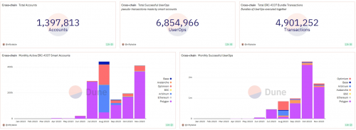 賬戶抽象的概念最早出現(xiàn)在2022年,隨著 EIP-4337: Account Abstraction Using Alt Mempool的更新(一個完全避免共識層協(xié)議更改的賬戶抽象提案,而是依賴于更高層級的基礎(chǔ)設(shè)施),不少團(tuán)隊開始圍繞賬戶抽象打造產(chǎn)品。 在終端產(chǎn)品上,目前的方向主要包括通過集成賬戶抽象實現(xiàn)了社交登錄,社交恢復(fù),代付gas,批量處理交易等功能的智能合約錢包, 在這面許多團(tuán)隊已經(jīng)在2023年交付了產(chǎn)品,包括Argent、Avocado、Unipass等,他們在用戶體驗上都做出了很大的創(chuàng)新。 據(jù)Dune數(shù)據(jù)顯示,目前全鏈已有接近140萬個基于EIP-4337創(chuàng)建的賬戶,產(chǎn)生了接近700萬次交易 (UserOps)。 截止本文發(fā)布,每月活躍的智能合約賬戶超過40萬。