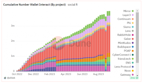 從2021年開始,SocialFi 這一賽道逐步進(jìn)入加密領(lǐng)域用戶的視野, 與鏈游的社交和娛樂屬性相似,被認(rèn)為是可以帶來大量Web3新用戶流量的現(xiàn)象級賽道。 相比2021-2022整個賽道較為冷淡的處境,2023年 SocialFi 賽道的一些玩法和設(shè)計上的創(chuàng)新獲得了不小的流量。 如下圖所示,整個 SocialFi 賽道在過去一年迎來了較好的發(fā)展,主流項目的累計錢包交互數(shù)接近400萬次以上,而Galxe、Friend.Tech、Sismo等新項目也收獲了不少流量。