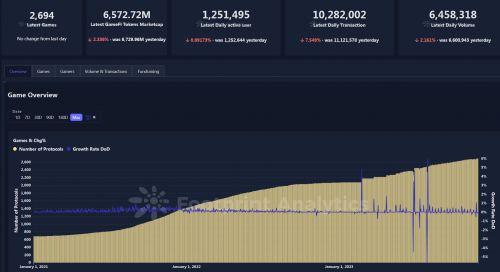 從下圖數(shù)據(jù)來看,2023年游戲項目仍保持持續(xù)增長態(tài)勢。 目前根據(jù)Footprint Analytics的項目數(shù)據(jù)統(tǒng)計(數(shù)據(jù)截止至2023年12月1日),當(dāng)前市場鏈游合約數(shù)超2600個,已發(fā)幣項目流通市值超65億美元,單日交易量超6百萬美元,日活地址數(shù)超1百萬個, 整體的市場仍在熊市下保持了一定的活躍度。