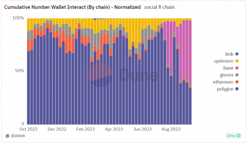 從特定鏈來看,目前主要的 SocialFi 項目交互集中在Polygon和Base兩條鏈上,其他鏈目前在社交領(lǐng)域收獲流量較少。 除了提供穩(wěn)定的網(wǎng)絡(luò)、快速的運(yùn)算速度和低廉的交互費(fèi)用外,Polygon在過去的1-2年的時間內(nèi)積極發(fā)展生態(tài)內(nèi)的各項游戲、NFT等應(yīng)用類項目, 同時拓展受眾群,與Web2大IP機(jī)構(gòu)合作,收獲了來自加密領(lǐng)域內(nèi)外的大量流量,在整個 SocialFi 賽道方面呈現(xiàn)出持續(xù)穩(wěn)定的流量增長。 Base得益于Friend.Tech所帶來的大量流量,目前占據(jù)了 SocialFi 賽道流量的半壁江山。 其他鏈如Ethereum和BNB等社區(qū)相關(guān)的流量增長相對比較緩慢。