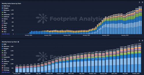 就GameFi項目發(fā)展而言,總體上,得益于上一輪牛市創(chuàng)業(yè)項目的發(fā)展和成熟,2023年度游戲項目增長較2022年有所增長, BNB仍然是目前游戲項目最多的生態(tài),Polygon、Ethereum、Wax緊隨其后,在游戲生態(tài)項目部署上具備一定的市場占有率。