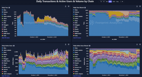 從具體的生態(tài)來看,目前整個市場的日活地址數(shù)超百萬,絕對流量集中在Wax鏈上。 得益于其低廉的交互成本和快捷的結(jié)算體驗,Wax歷經(jīng)牛熊仍然保持了其最高的市場占有率地位, 其他的公鏈如Near、Celo和Polygon等也有一定的市場占有率。