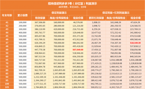 招商信諾利多多3號(hào)(分紅型)有效保額每年以2.5%遞增,抵御不確定的市場變化。以40歲男性投保利多多3號(hào),年交10萬為例,假設(shè)紅利實(shí)現(xiàn)率達(dá)到100%,依照紅利演示,長期保單總利益可以超過總保費(fèi)的8倍多!