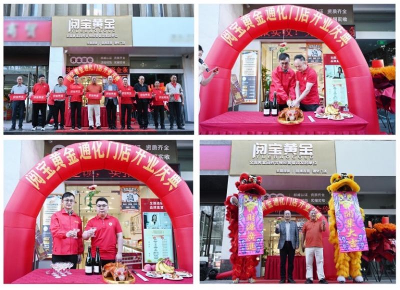通化門店的開業(yè)儀式中,領(lǐng)導(dǎo)嘉賓登臺致辭,表達(dá)了對新店未來發(fā)展的美好祝愿。在剪彩環(huán)節(jié),周曉帆先生、連俊江先生、張俊偉先生、陳輝龍先生、紀(jì)曉明先生、黃超群先生、張小龍先生、陳敬灶先生、黃海榮先生、鐘亨城先生手持金剪,隨著彩帶的剪開,象征著閱寶黃金通化門店正式踏上黃金服務(wù)的新征程。切金豬環(huán)節(jié)由張俊偉先生和陳輝龍先生執(zhí)禮,以莊重之姿祈愿門店事業(yè)長青。緊接著,張俊偉先生和鄭柏川先生共同注酒,金色香檳層層遞進(jìn),寓意著店內(nèi)黃金業(yè)務(wù)將如香檳塔般層層遞進(jìn),蒸蒸日上。點睛環(huán)節(jié)由周曉帆先生和連俊江先生執(zhí)筆,雙筆齊落,為祥獅點染“金睛”。隨后,靈獅采青納福,接“財氣”入店,以靈動之姿繞柜灑金,為門店帶來吉祥與好運。
