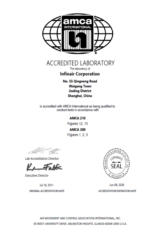 CNAS實驗室能力覆蓋:①風(fēng)量、風(fēng)壓、功率性能測試②噪聲與振動測試③高低溫耐久試驗④鹽霧腐蝕試驗⑤防護(hù)與淋雨測試。同時,引入AMCA認(rèn)證體系,對風(fēng)量、風(fēng)壓、效率等關(guān)鍵指標(biāo)進(jìn)行嚴(yán)格實測驗證,為設(shè)計院選型、工程計算和項目交付提供透明、可信的數(shù)據(jù)基礎(chǔ)。