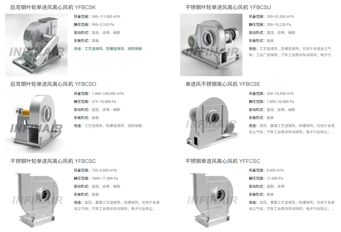 圍繞耐腐蝕、高可靠、復(fù)雜工況適配等核心需求,英飛構(gòu)建了完整的不銹鋼風(fēng)機(jī)產(chǎn)品體系,形成八大系列型號矩陣,可精準(zhǔn)匹配不同工業(yè)場景。